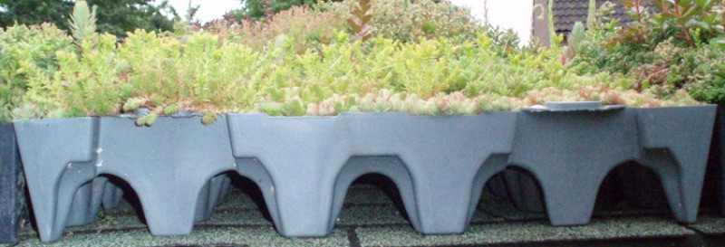 De cassettes zijn volledig begroeid met 5 tot 8 verschillende soorten Sedum. De cassette is gevuld met een substraat dat fungeert als groeimedium en zorgt voor de waterbuffering.